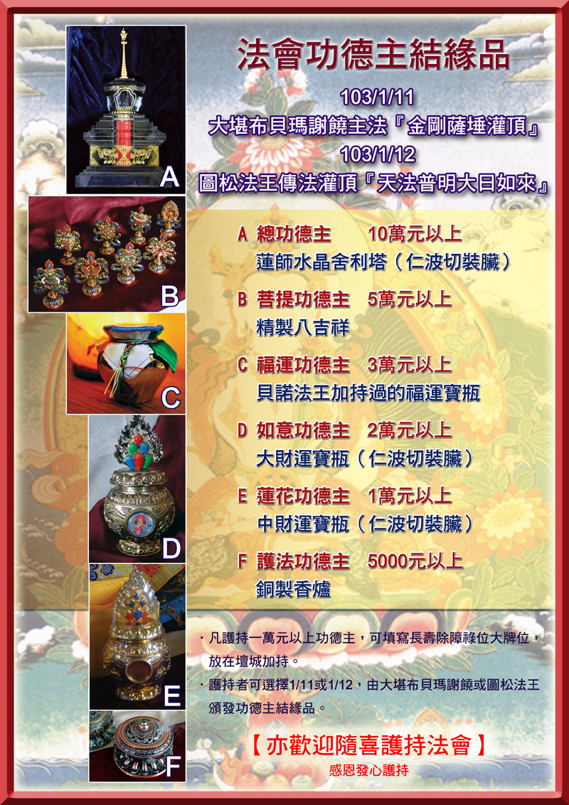 台南白玉中心於103年1月11日及1月12日敦請尊貴的大堪布貝瑪謝饒及圖松法王蒞臨傳法,此法緣殊勝難得,為使法會得以圓滿,索南多傑仁波切特別費心準備多種結緣品,經過法會加持後要贈送給發心護持法會的功德主,敬祈十方善眾及具緣弟子珍惜此得以種下福德及善根的機緣,共同護持法會的圓滿.