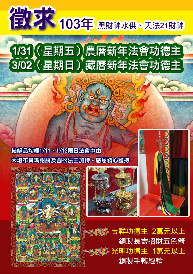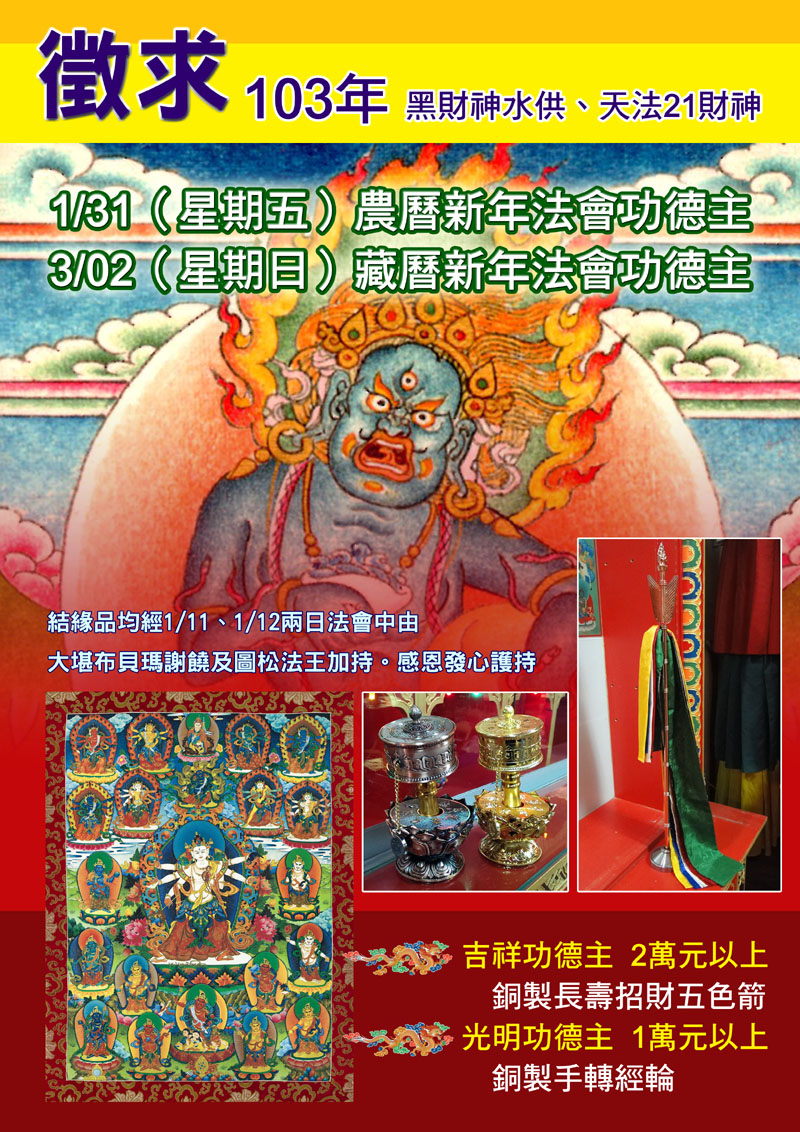 103年1月31日及3月2日分別為台灣農曆新年及藏曆新年,當天索南多傑仁波切特別舉辦黑財神水供集資法會及天法21財神修法加持為弟子們祈福,並與弟子共進藏式吉祥飯和奶茶及賜予甘露水,為使法會圓滿,仁波切亦準備"長壽招財五色箭"及"手轉經輪"兩項珍貴法器,並請大堪布及圖松法王於法會加持過,要贈送給發心護持新年法會的善眾及弟子,請向中心或仁波切洽詢.