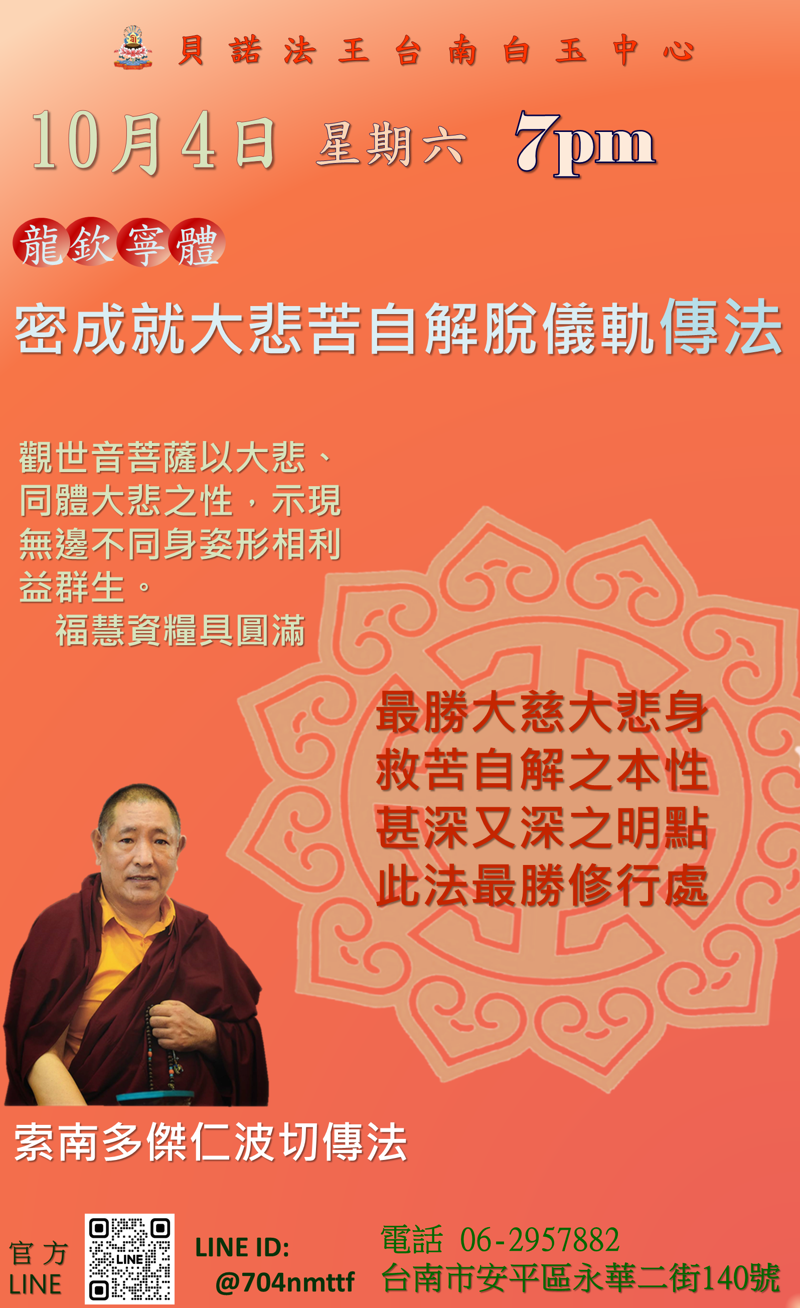 10/4星期六 7pm龍欽寧體 密成就大悲苦自解脫儀軌 傳法