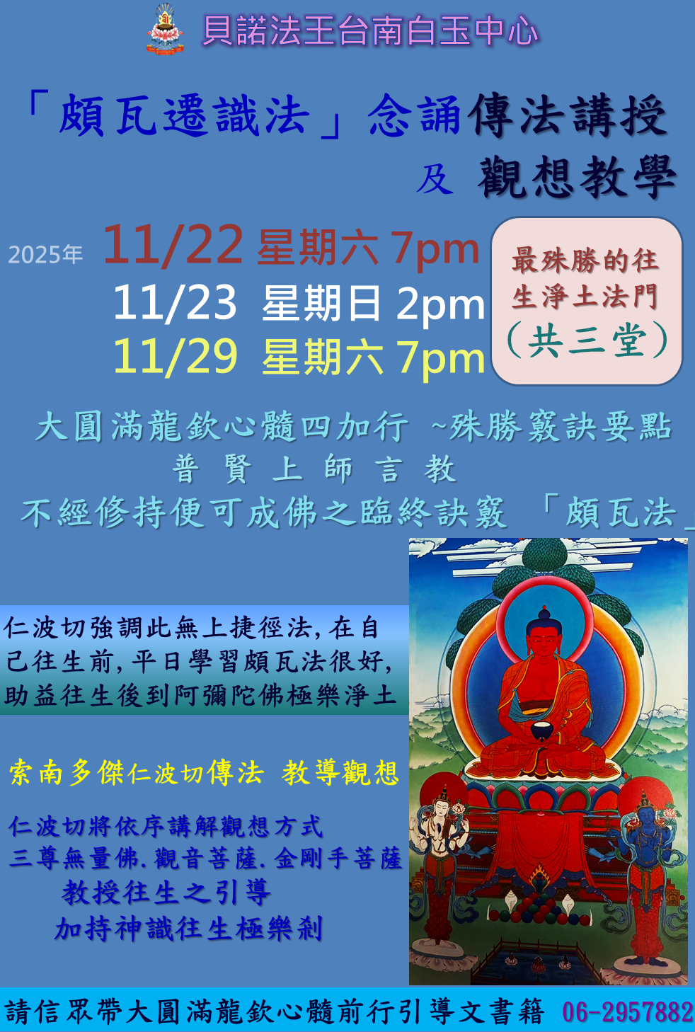 11/22星期六晚上.11/23星期日下午.11/29星期六晚上(三堂) 頗瓦遷識法念誦傳法及觀想教學 , 請信眾帶大圓滿龍欽心髓前行引導文書籍
