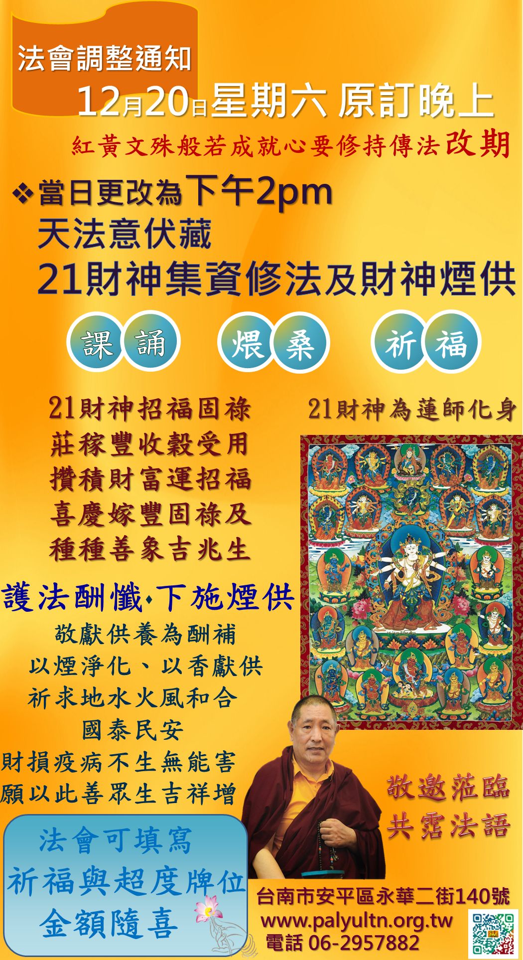 法會調整通知! 12月20日星期六 更改為下午2pm 天法意伏藏21財神集資修法及財神煙供~法會可隨喜填寫祈福與超度牌位