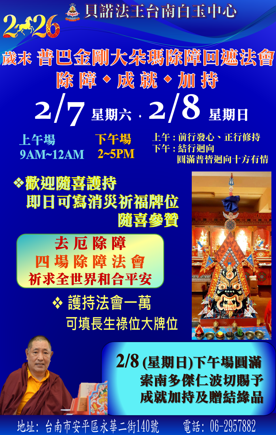 115.2/7星期六~2/8 星期日(兩日)9AM-12AM;2-5PM共四場 歲末 普巴金剛大朵瑪除障回遮法會 除 障.成 就.加 持